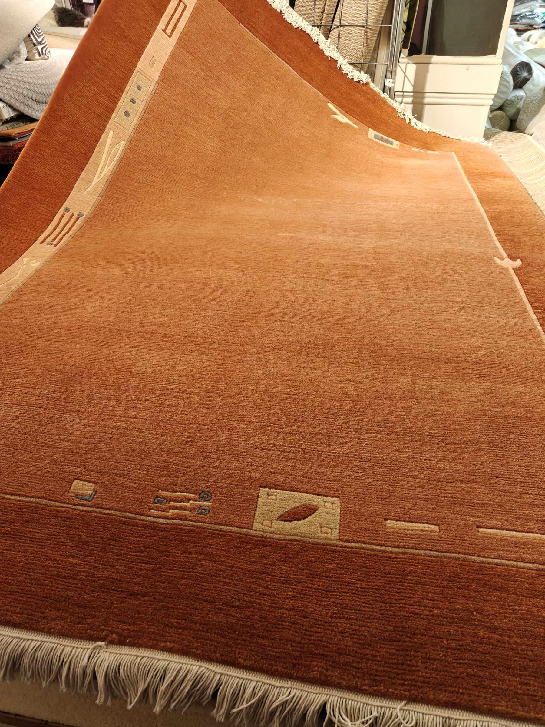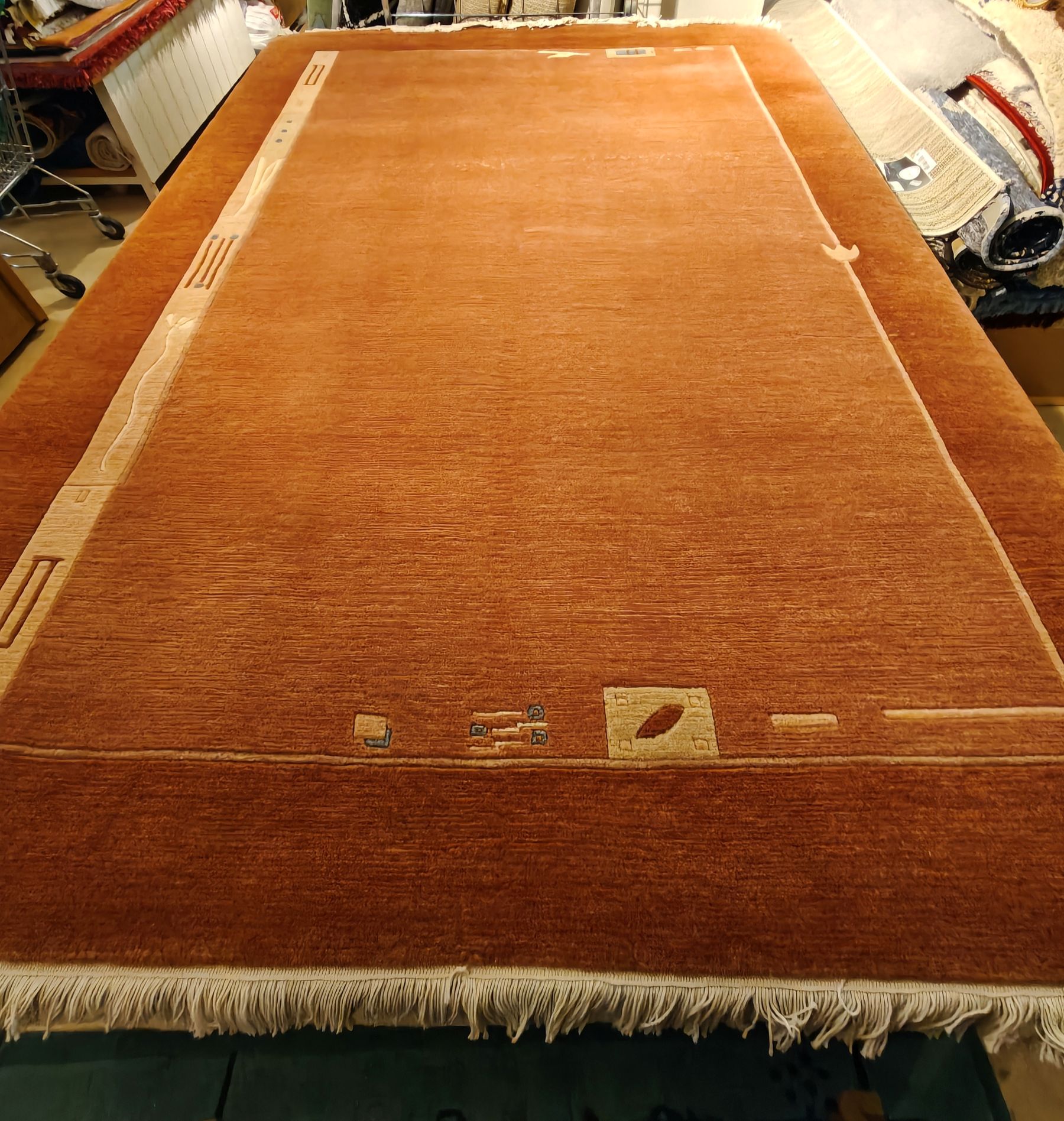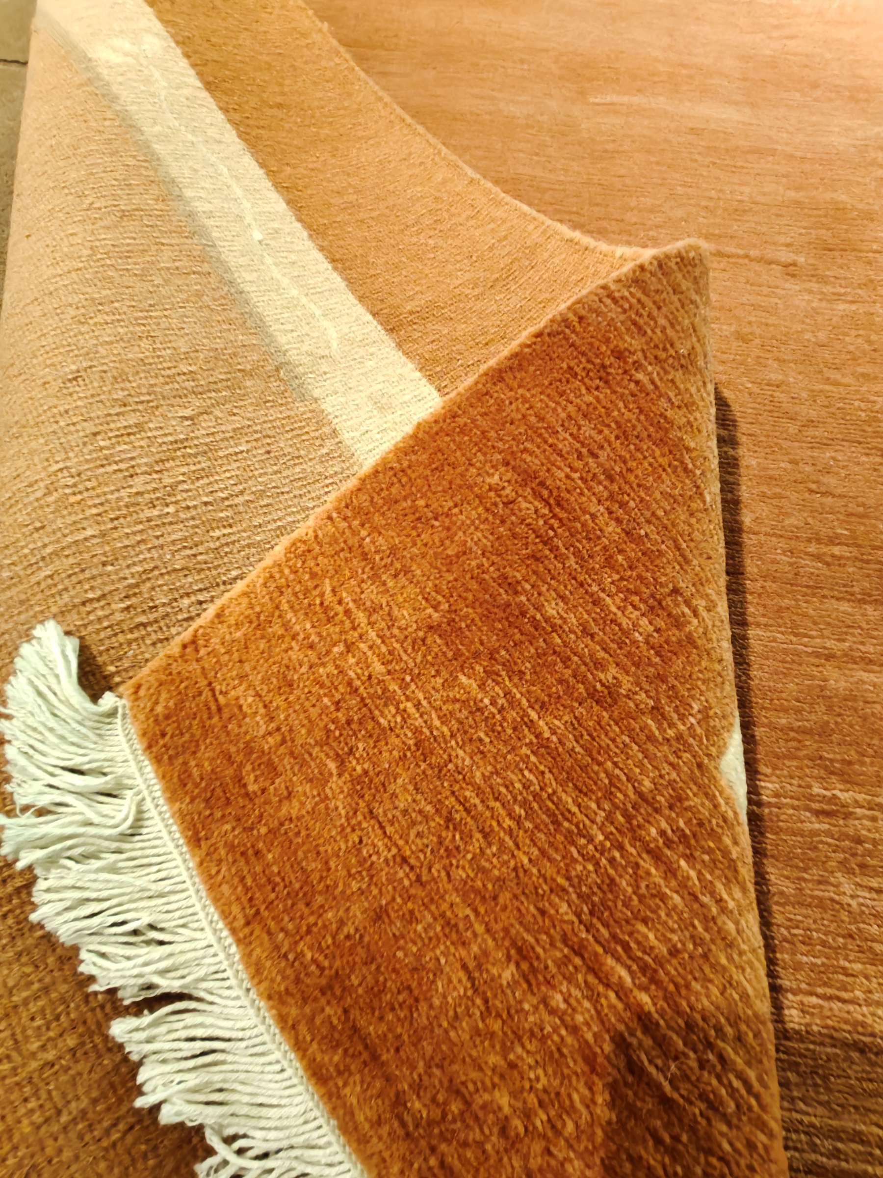 Upea ja lämpimän terran/oranssin värinen käsinsolmittu villamatto.