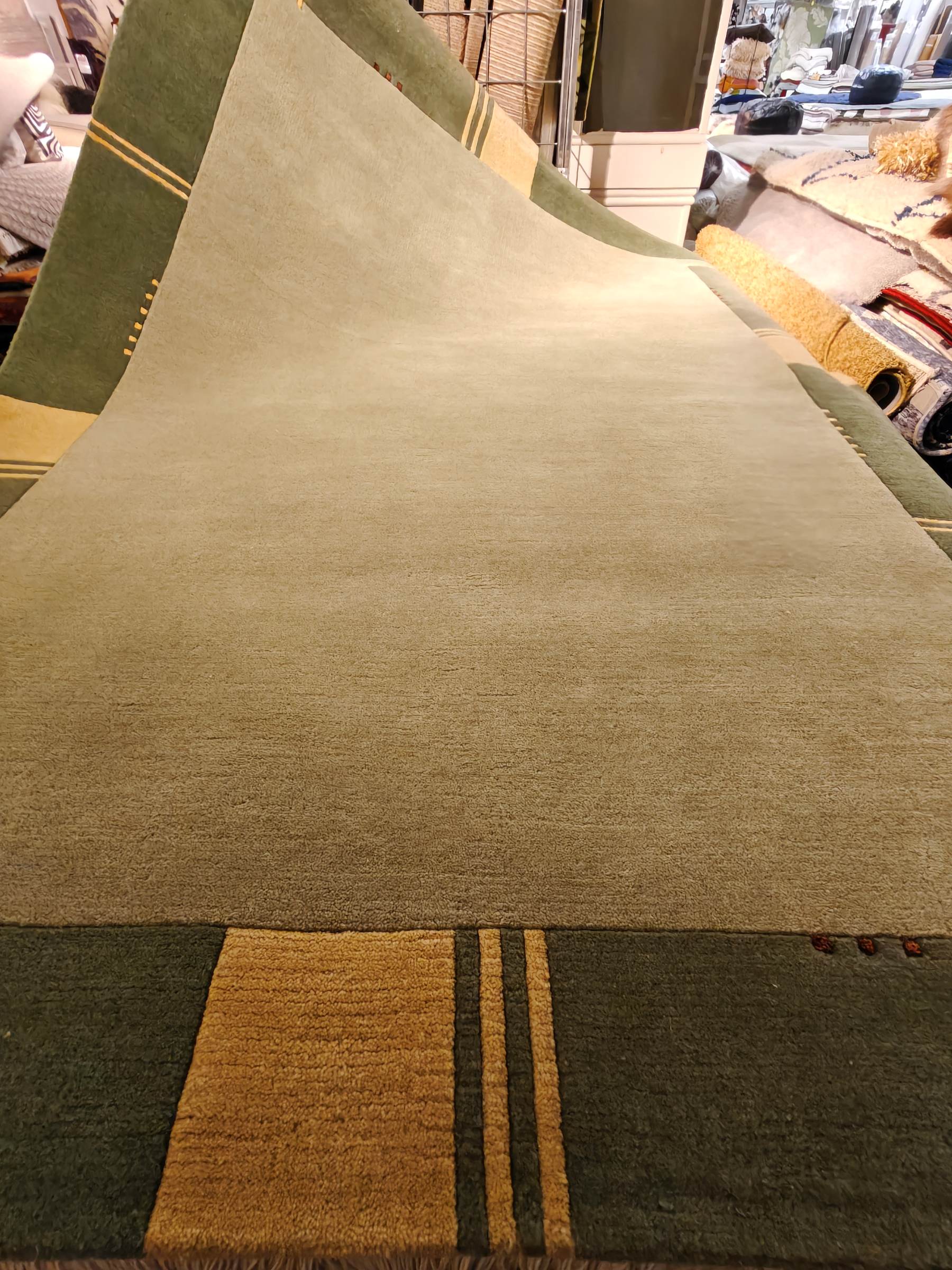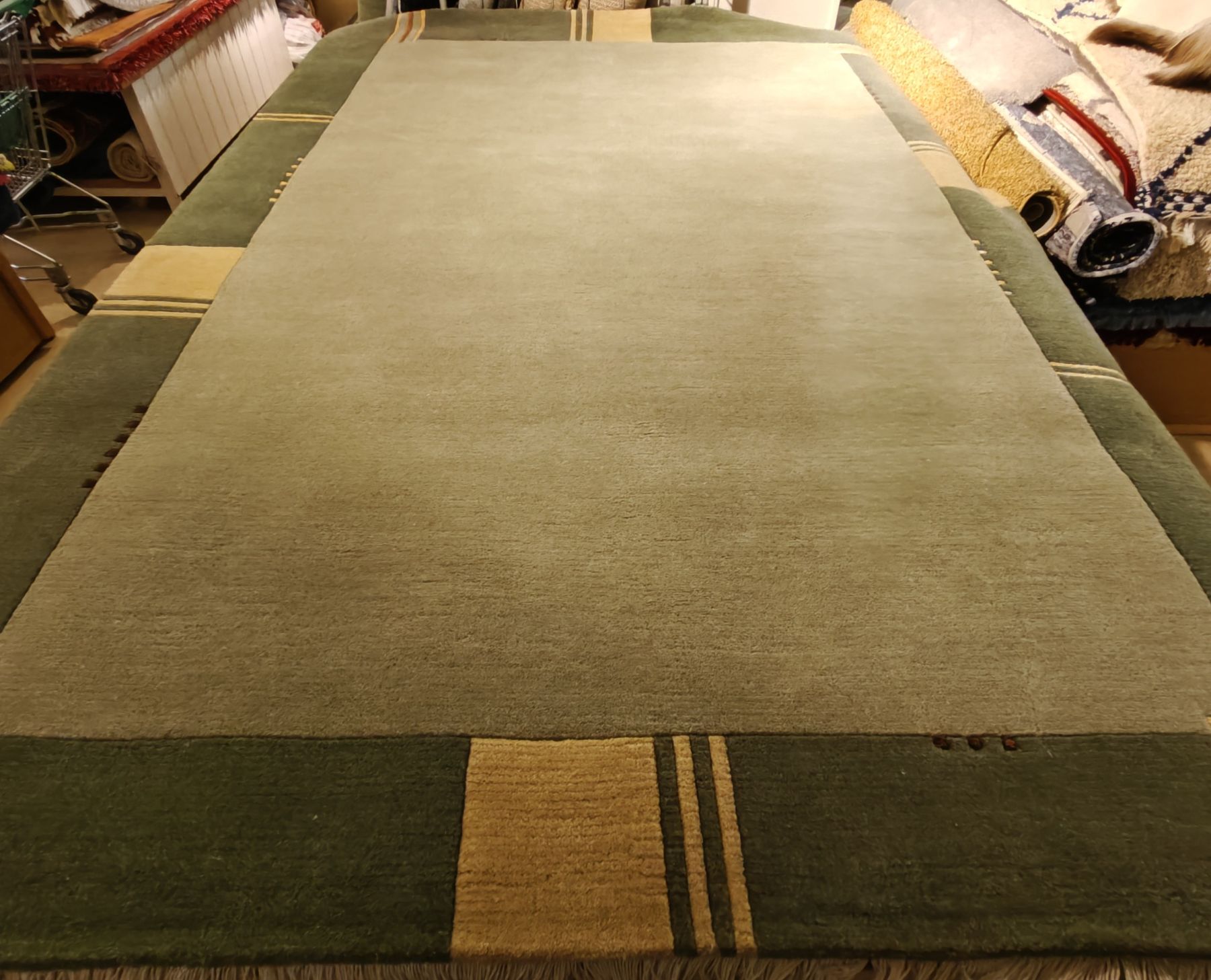Käsinsolmittu intilainen villamatto. Kaunis ja hillityn vihreä väri sopii moneen sisustukseen. Ei hapsuja päissä.