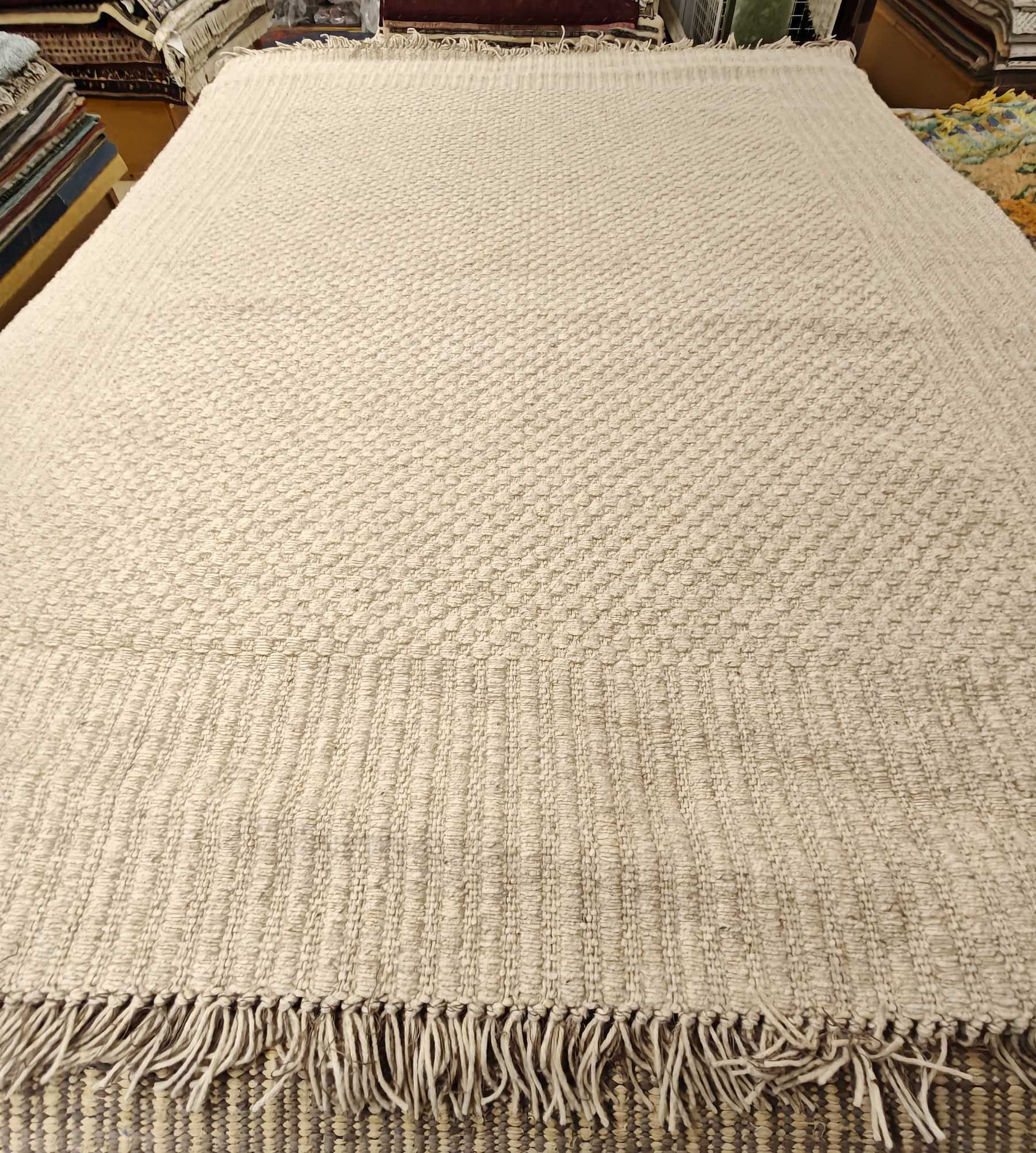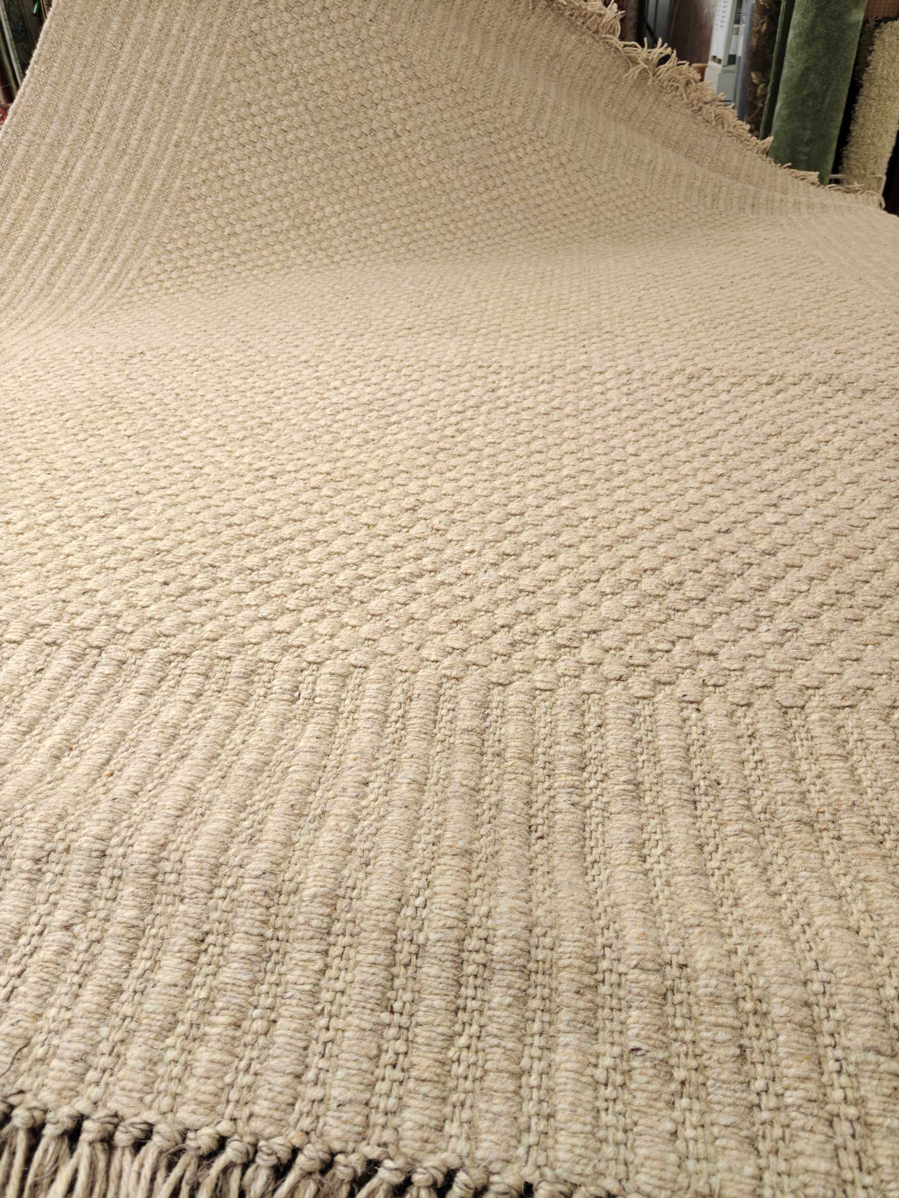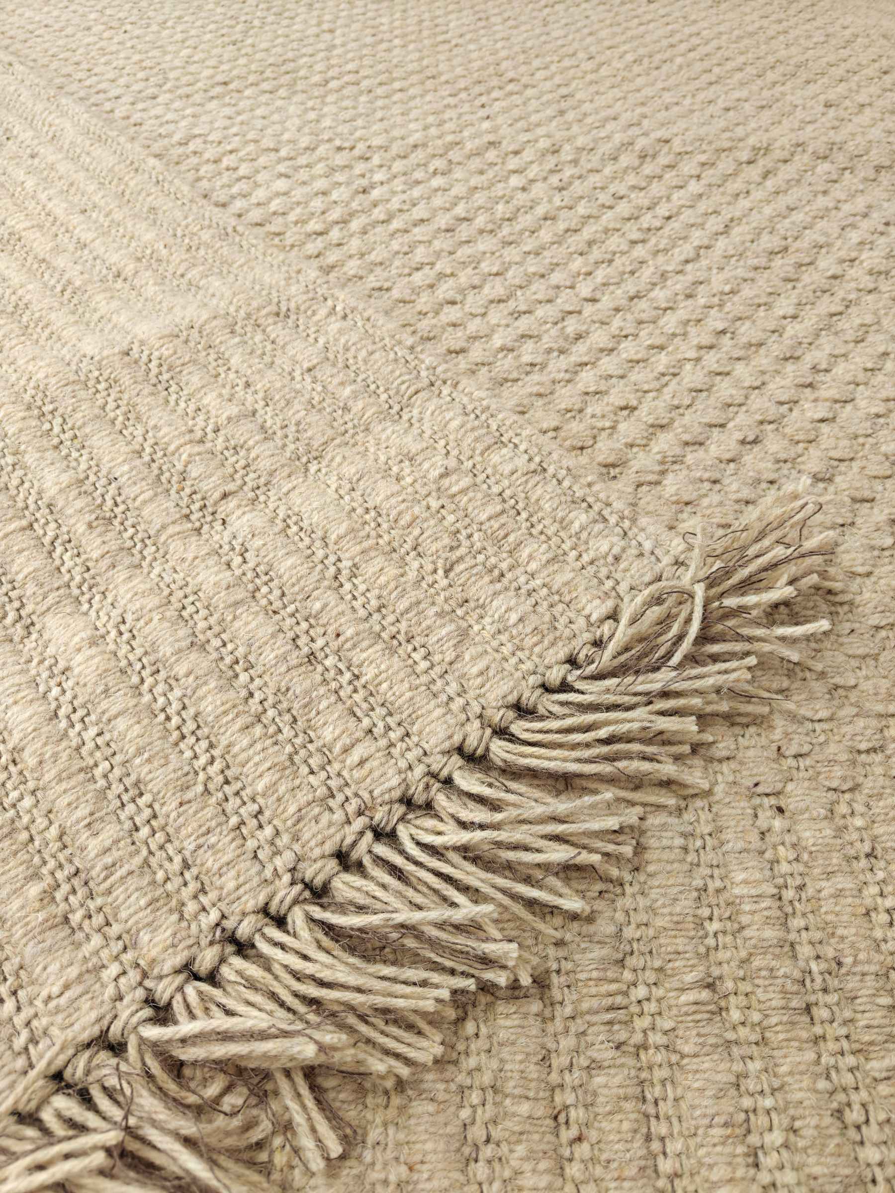 Laadukas kotimainen molemmin puolin pidettävä villamatto. Hapsut päissä.