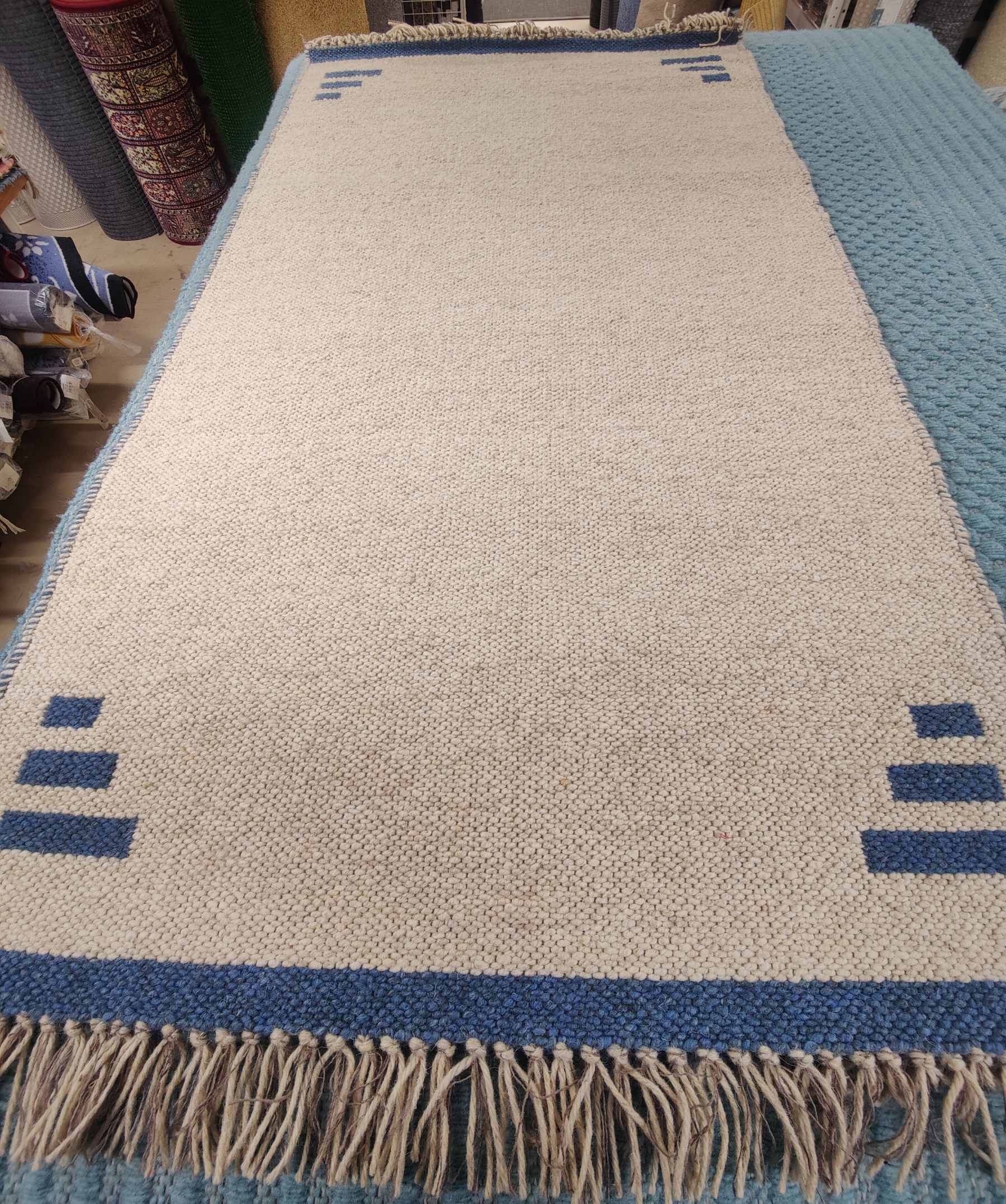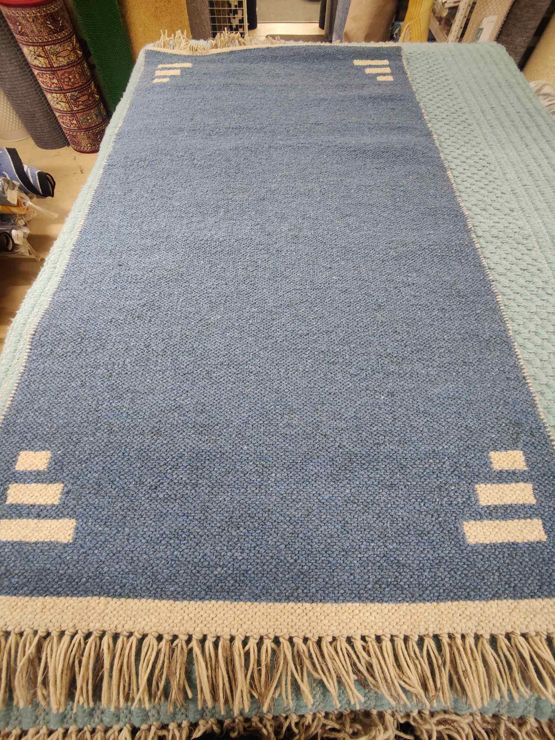 Laadukas kotimainen molemmin puolin pidettävä villamatto. Hapsut päissä.