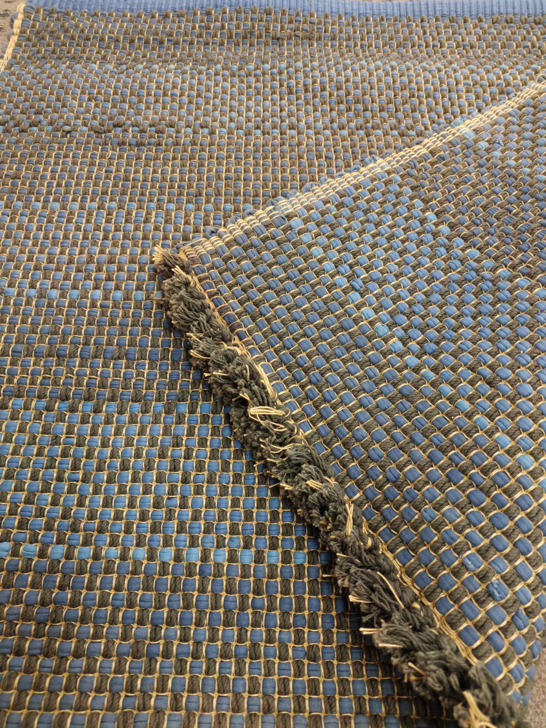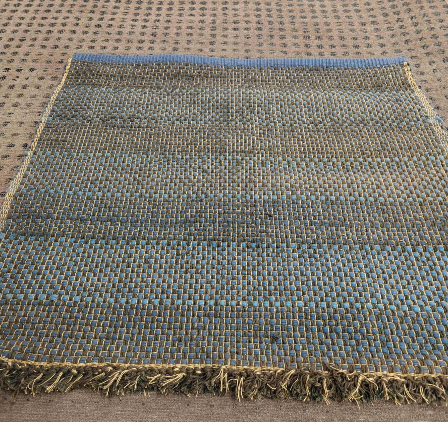 Puuvillainen kynnysmatto koko noin 65 x 75 cm. maton toisessa reunassa hapsut.