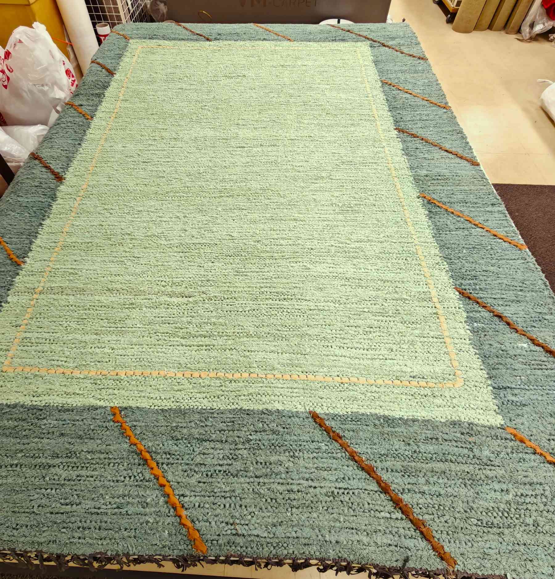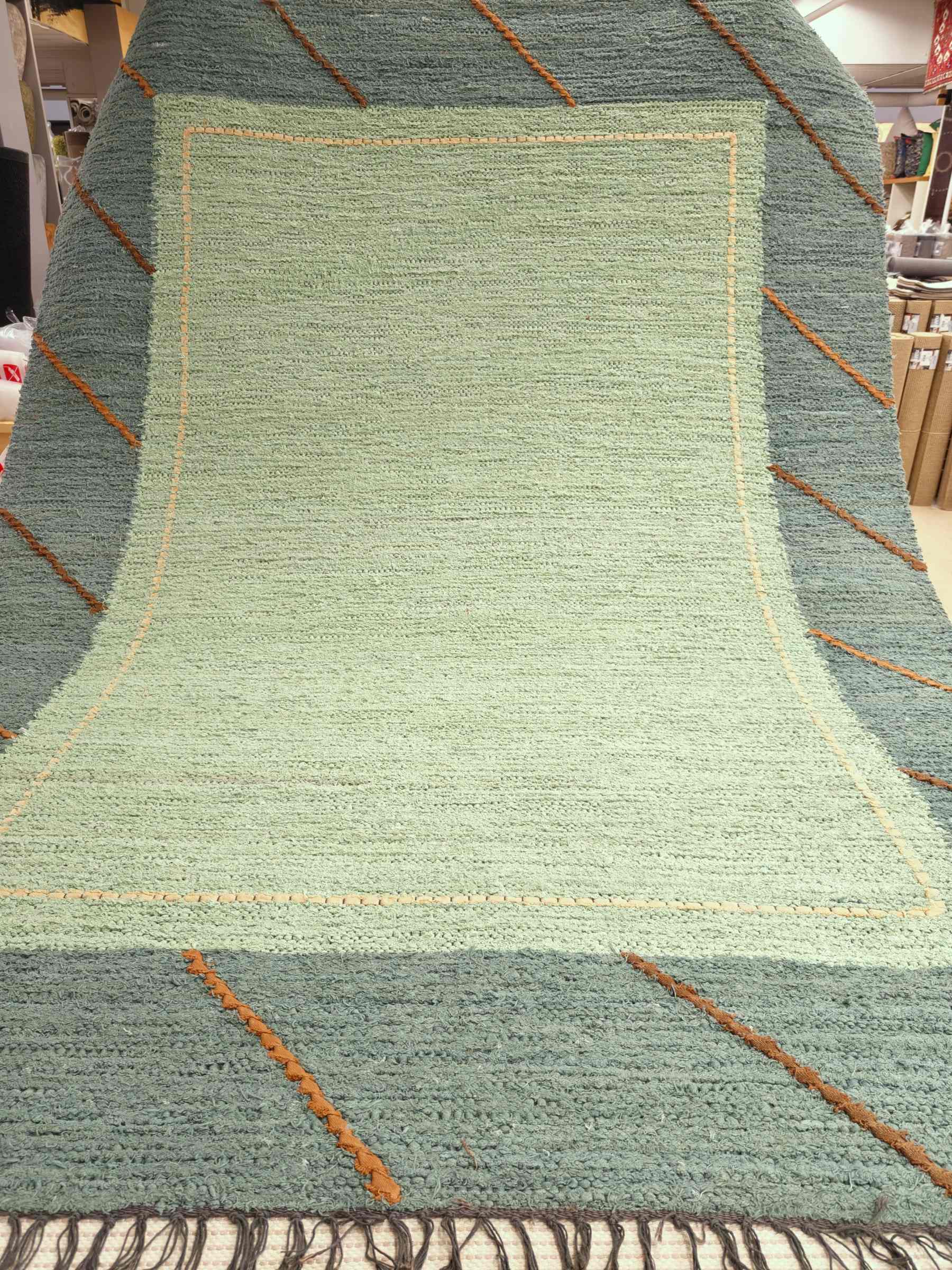 Eija Rasinmäen suunnittelema, kauniin vihreän sävyinen puuvillamatto.
