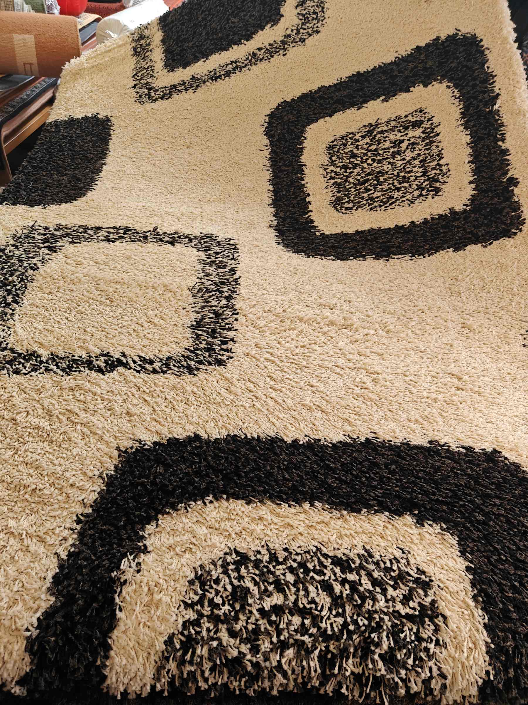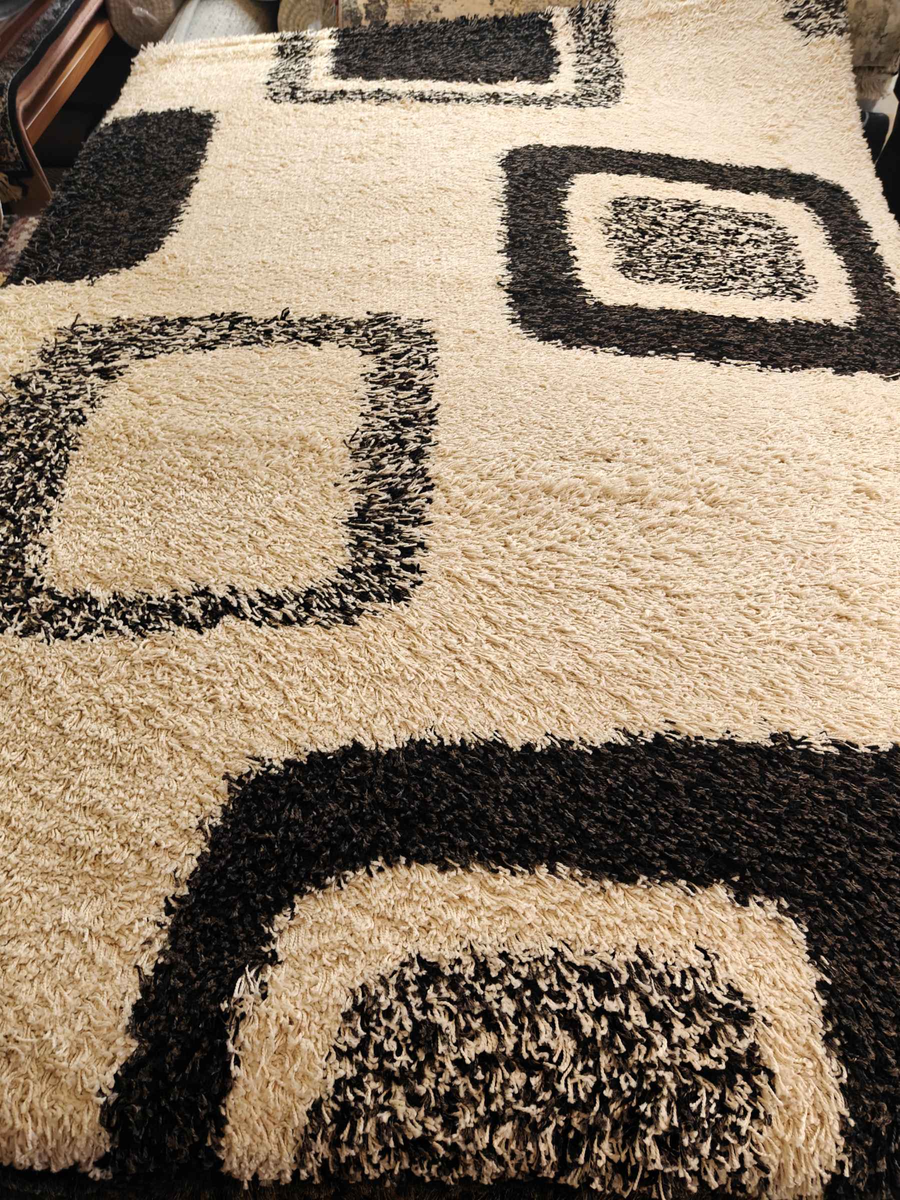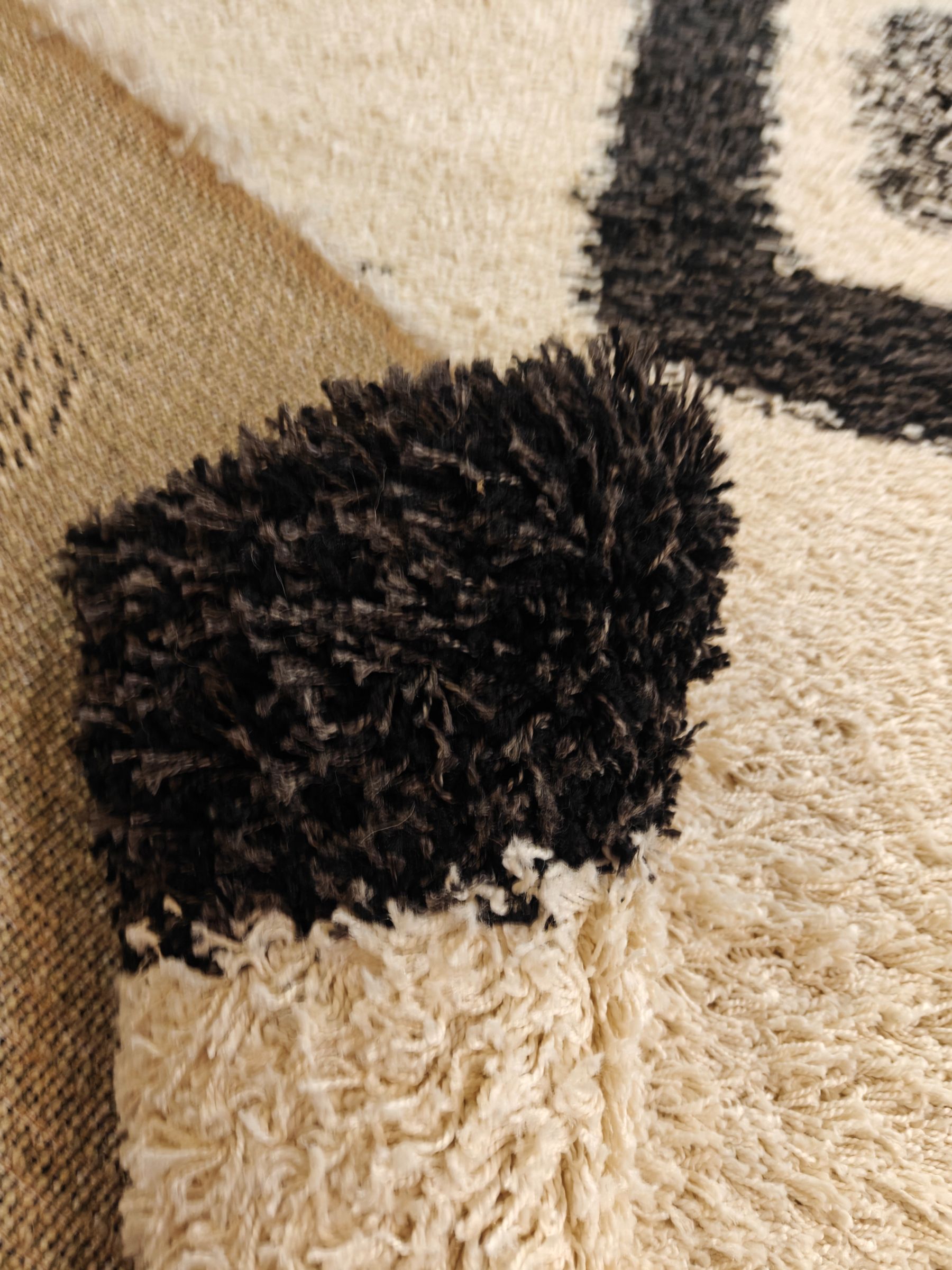Tyylikäs mustavalkoinen nukkamatto, mikä sopii kodin moneen tilaan.