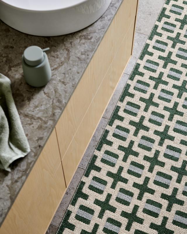 Jotta mattosi näyttäisi parhaalta, imuroi se säännöllisesti ja huuhtele roiskeet välittömästi. Vältä tahrojen hieromista, koska se voi vahingoittaa materiaalia. Älä koskaan rumpukuivaa ja varo taittamasta hitsattuja reunoja, koska ne voivat vaurioitua. Jos matto kastuu, venytä reunat tasaisesti ja ripusta se aina kuivumaan leveän tangon tai useiden linjojen päälle, jotta ne eivät rypisty.